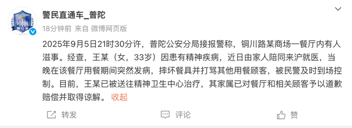 ·商场餐厅内有人滋事、摔坏餐具还打骂顾客?上海市公安局普陀分局官方微博发布通报。