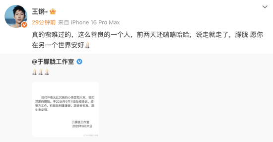 王锵:“真的蛮难过的,这么善良的一个人,前两天还嘻嘻哈哈,说走就走了,朦胧,愿你在另一个世界安好。”
