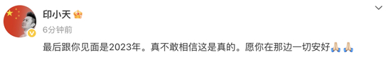 印小天:“最后跟你见面是2023年。真不敢相信这是真的。愿你在那边一切安好。”