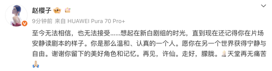 赵樱子:“至今无法相信,也无法接受……想起在新白剧组的时光,直到现在还记得你在片场安静读剧本的样子。你是那么温和、认真的一个人。愿你在另一个世界获得宁静与自由。谢谢你留下的美好角色和记忆。再见,许仙。走好,朦胧。天堂再无痛苦。”