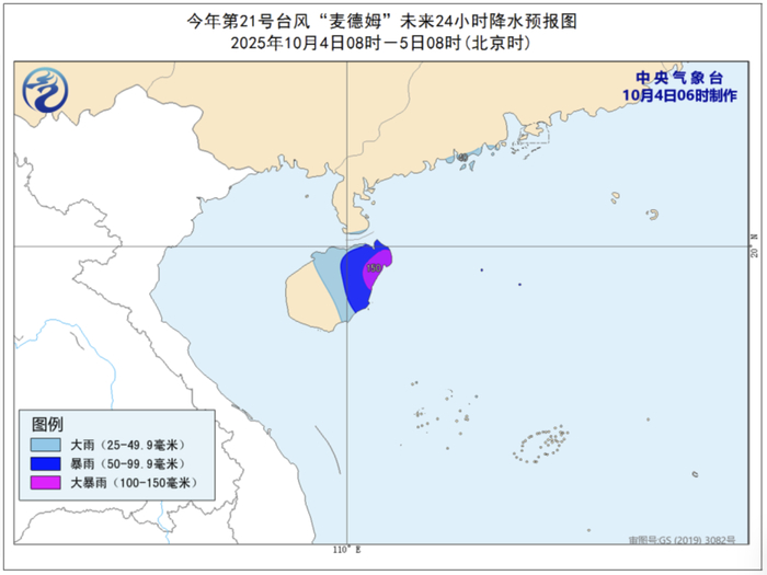 降水预报:4日08时至5日08时,广东西部沿海、海南岛中东部有大到暴雨,其中,海南岛东北部有大暴雨(100-150毫米)。