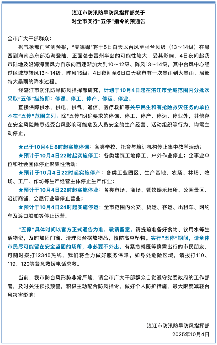 经湛江市防汛防旱防风指挥部研究,计划于10月4日起在湛江市全域范围内分批次采取“五停”措施即:停课、停工、停产、停运、停业。实行“五停”期间,请全体市民尽可能留在安全坚固的场所,非必要不外出。
