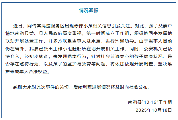 央视网消息:据“南涧融媒”微信公众号消息,南涧县“10·16”工作组10月18日发布通报:近日,网传某高速服务区出现赤裸小孩相关信息引发关注。对此,孩子父亲户籍地南涧县委、县人民政府高度重视,第一时间成立工作组,积极协同事发属地联动开展处置工作,并多方联系当事人及家属,进行沟通劝导。由于当事人目前仍在省外,南涧县已派出工作小组赶赴所在地开展相关工作。同时,公安机关已依法介入,经初步核查,未发现拐卖行为。针对社会普遍关心的孩子健康状况、是否存在虐待行为,以及孩子的监护与教育等问题,将依法依规开展调查,坚决维护未成年人合法权益。