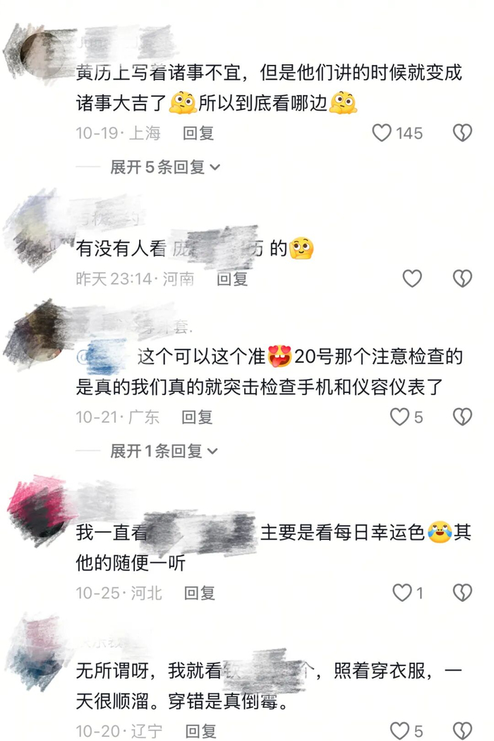 有网友坦言,自己已习惯每天查看电子黄历,甚至因“穿错颜色”而心慌,将日常不顺归咎于未遵循博主建议,“感觉不跟着黄历穿衣服就会走霉运”。