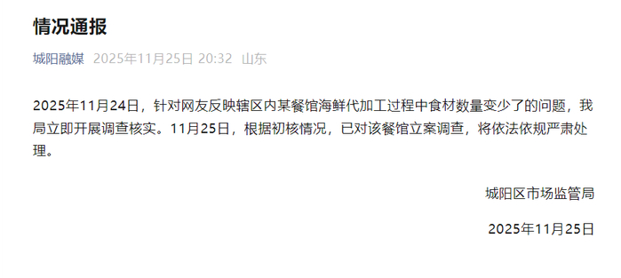 ·山东青岛通报“海鲜代加工偷虾”事件:已对涉事餐馆立案调查。