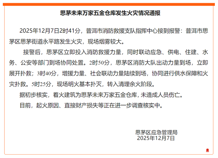 据初步核实,着火建筑为思茅未来万家五金仓库,未造成人员伤亡。目前,起火原因、直接财产损失等正在进一步调查核实中。