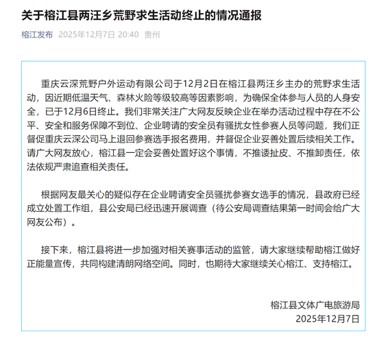 据“榕江发布”公众号消息,12月7日,榕江县文体广电旅游局发布情况通报:重庆云深荒野户外运动有限公司于12月2日在榕江县两汪乡主办的荒野求生活动,因近期低温天气、森林火险等级较高等因素影响,为确保全体参与人员的人身安全,已于12月6日终止。我们非常关注广大网友反映企业在举办活动过程中存在不公平、安全和服务保障不到位、企业聘请的安全员有骚扰女性参赛人员等问题,我们正督促重庆云深公司马上退回参赛选手报名费用,并督促企业妥善处置后续相关工作。请广大网友放心,榕江县一定会妥善处置好这个事情,不推诿扯皮、不推卸责任,依法依规严肃追查相关责任。