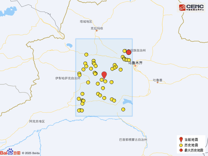 历史地震:根据中国地震台网速报目录,震中周边200公里内近5年来发生3级以上地震共71次,最大地震是2022年7月20日在新疆昌吉州昌吉市发生的4.8级地震(距离本次震中197公里),按震级大小前50次历史地震分布如图。