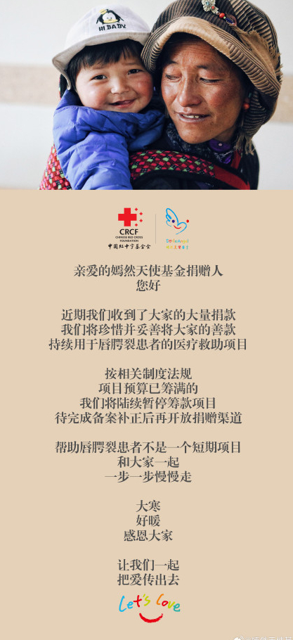 1月20日,嫣然天使基金发文称,近期收到了大家的大量捐款。“我们将珍惜并妥善将大家的善款持续用于唇腭裂患者的医疗救助项目。按相关制度法规,项目预算已筹满的,我们将陆续暂停筹款项目,待完成备案补正后再开放捐赠渠道。”