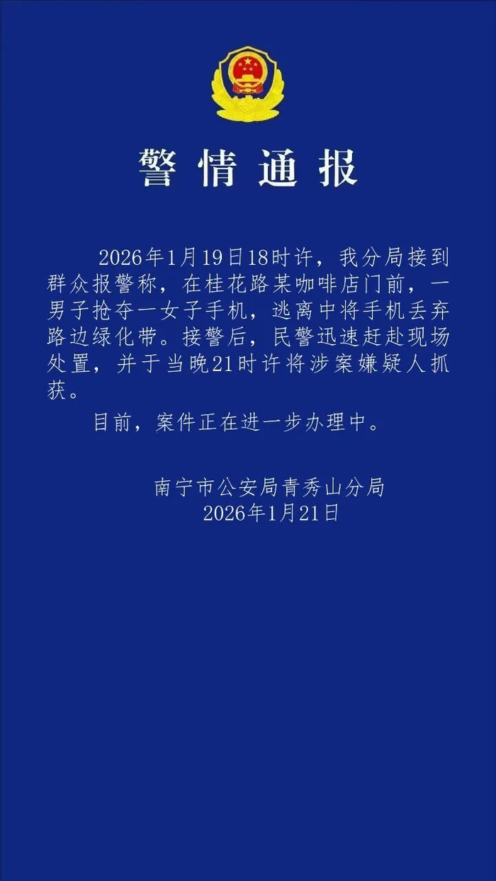 央视网消息:据青秀山警方微信公众号消息,1月21日,南宁市公安局青秀山分局发布警情通报。1月19日18时许,南宁市公安局青秀山分局接到群众报警称,在桂花路某咖啡店门前,一男子抢夺一女子手机,逃离中将手机丢弃路边绿化带。接警后,民警迅速赶赴现场处置,并于当晚21时许将涉案嫌疑人抓获。目前,案件正在进一步办理中。