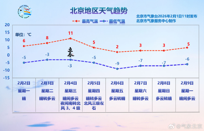 明天迎来新的一周,预计未来一周大部分时间以晴到多云为主,气温先升后降。其中4日(周三)白天最高气温可升至11℃,而5日前后受较强冷空气影响,又会迎来大风降温天气。2月初刚现小暖,就又被冷空气拉回数九寒冬。请大家关注临近天气变化,及时做好防范。