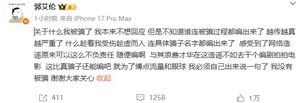 4月7日,篮球运动员郭艾伦发文否认被诈骗近千万,其称:“关于什么我被骗了,我本来不想回应,但是不知道谁连被骗过程都编出来了,越传越真越严重了,什么趁着我受伤趁虚而入,连具体骗子名字都编出来了,感受到了网络造谣原来可以这么不负责任,随便编啊,与其浪费才华在这造谣不如去干个编剧拍拍电影,这比真骗子还能编吧,就为了博点流量和眼球,我必须自己出来说一句了,我没有被骗,谢谢大家关心。”
