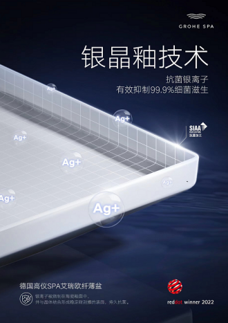 德国高仪SPA艾瑞欧纤薄盆采用银晶釉的釉面技术,将抗菌银离子烧制在陶瓷釉面中,并与晶体结合形成稳定耐刮擦的抑菌釉面,有效抑制99.9%细菌滋生,保持陶瓷表面的持久亮丽如新。