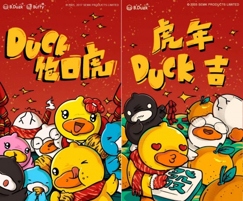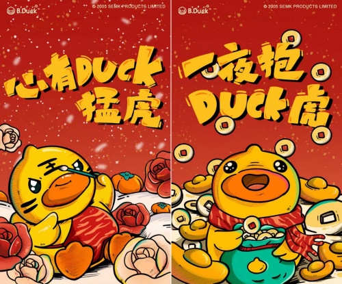“红包”在中国自古以来就是一个充满着爱与期待的物件,送出的是红包,其实是长辈对晚辈以及亲人之前的慰问和殷切的祝福,春节红包更是带着一整年期许和心意。随着时代进步,红包不再是纸质实体,也逐渐演变为线上抢红包,在祝福的同时还能加强互动趣味。由此延伸的红包封面成为新的营销点。一款品牌定制、设计个性的红包封面就成了个人的社交货币,用来彰显个人喜好和与众不同,是过年期间十分抢手的仪式感“年货”。作为Z世代备受喜爱的IP品牌,B.Duck推出了四款微信红包封面,包括:“心有DUCK猛虎”、“一夜抱DUCK虎”、“DUCK抱口虎”和“虎年DUCK吉”,上线后的在短短几分钟内即被一抢而空,后经粉丝群体辐射至其它圈层,在用户过年互发红包时刷足了存在感,也为人们过一个喜气洋洋的虎年添了一份别致年味。而在设计中包含了小黄鸭自身风格和年轻人喜爱的国潮元素,让大家在送红包的同时,也能够感受到国潮文化与新春传统结合后带来的另一种新鲜感。