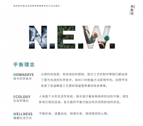 随着健康意识的提升推进了饮食结构的升级,更多的消费者开始注重食品的营养价值。“燕教授就此提出了“N.E.W.平衡理念”,并围绕此核心理念进行产品开发,提供一套完整的健康管理解决方案。