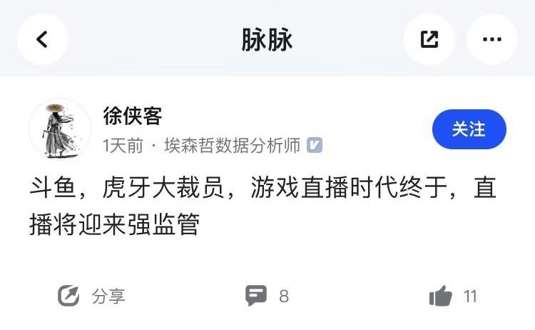 在职场社区平台脉脉上,游戏直播行业的前景备受关注,不少脉友认为游戏直播行业正在入冬,甚至有认证为埃森哲数据分析师的脉友表示,“斗鱼、虎牙大裁员,游戏直播时代终结,将迎来强监管。”