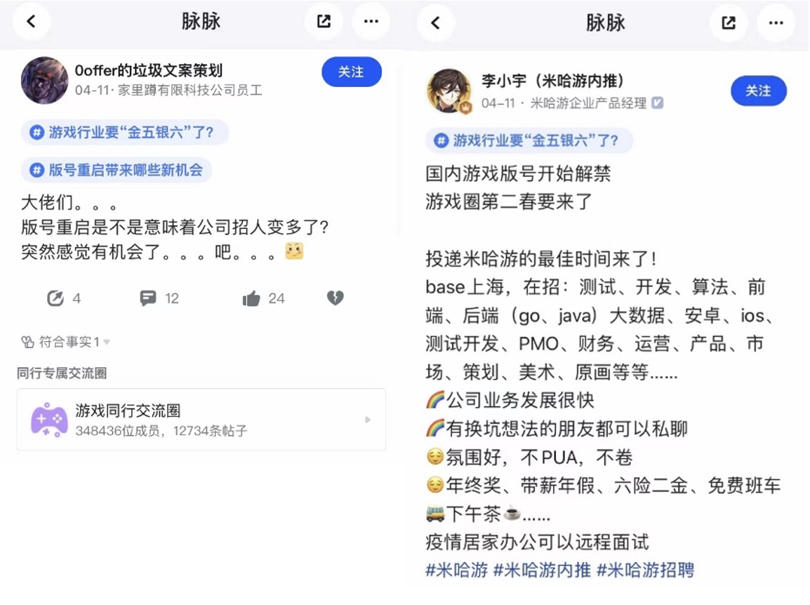 在脉脉上,#游戏行业要“金五银六”了?#成为站内高热度话题。“游戏人做好准备,大规模扩招要开始了!”“游戏行业回暖了,是不是要开始招人了?”不少公司已经开始主动出击,发帖招聘。