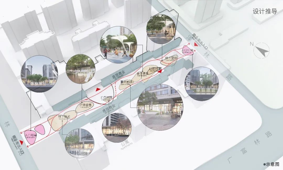 同时,从人们的生活角度出发,中间区域置入多功能空间,将亲子看护、林下广场、特色旱喷、儿童活动、秘境花园、林下吧台、对景水景、生活剧场等功能与植物置入商业街。