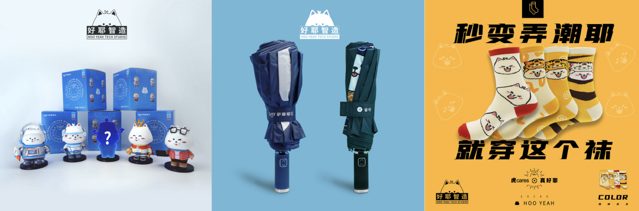乘着话题热度种草内容的东风,潮袜和晴雨伞也陆续在“好耶智造”的微店上架,尤其是一套4款的潮袜既契合虎年主题,又萌趣吸睛。与盲盒一样,每款基于好耶形象的潮袜设计也被赋予了美好的寓意。