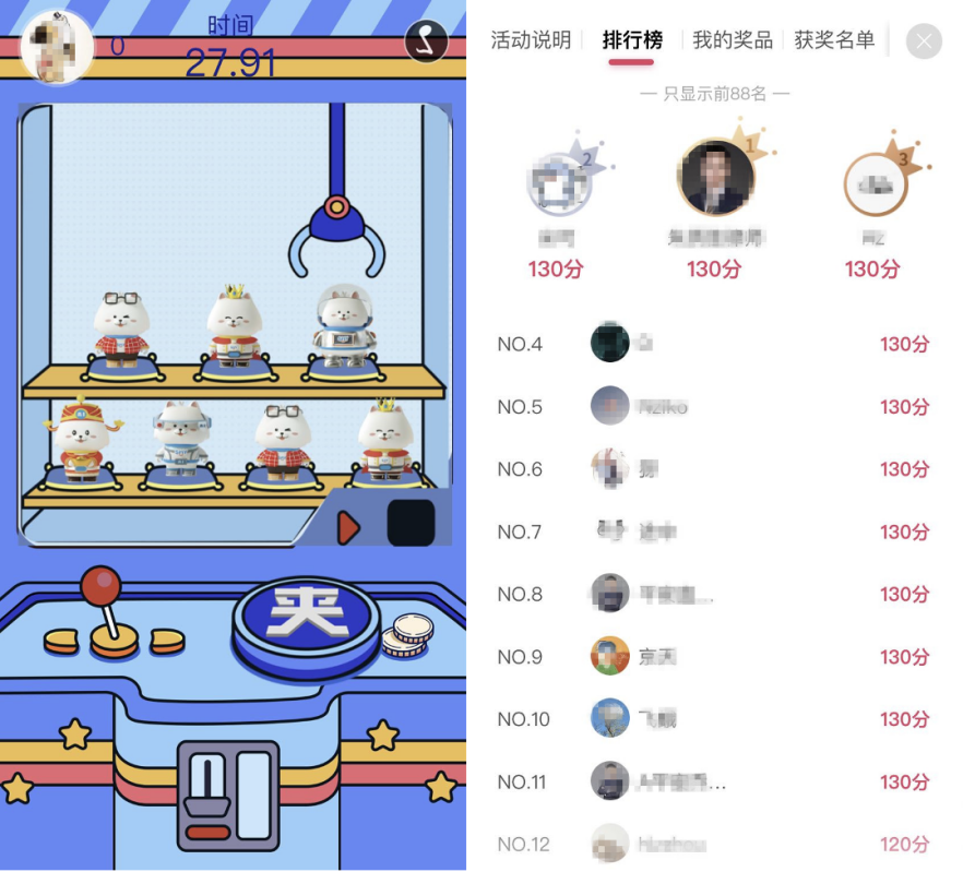 为了给予用户更多的福利,5月27-30日活动期间,省呗更是推出了在线娃娃机,号召双微粉丝参与“抓好耶 赢盲盒”的互动活动,累计积分排名前88名的用户,将免费获赠随机好耶盲盒1份。这个低门槛且沉浸式的活动形式一经推出并吸引大批用户参与,积分榜的排名在活动期间几度变化也侧面体现了该系列盲盒受欢迎的火热程度。