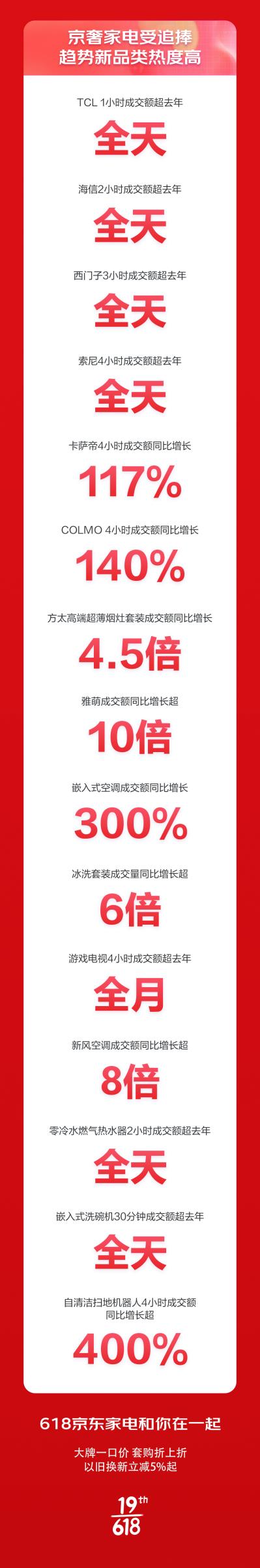今年京东家电618呈现出的一个明显消费特点就是精致、轻奢,京奢家电受追捧,消费者乐于为追求自己想要的美好生活而买单。据京东家电4小时战报数据显示,TCL 1小时成交额超去年全天,海信2小时成交额超去年全天,西门子3小时成交额超去年全天,索尼4小时成交额超去年全天,卡萨帝4小时成交额同比增长117%,COLMO 4小时成交额同比增长140%,方太高端超薄烟灶套装成交额同比增长4.5倍,雅萌成交额同比增长超10倍,嵌入式空调成交额同比增长300%,冰洗套装成交量同比增长超6倍;游戏电视成交额超去年全月,新风空调成交额同比增长超8倍,零冷水燃气热水器2小时成交额超去年全天,嵌入式洗碗机30分钟成交额超去年全天,自清洁扫地机器人成交额同比增长超400%。