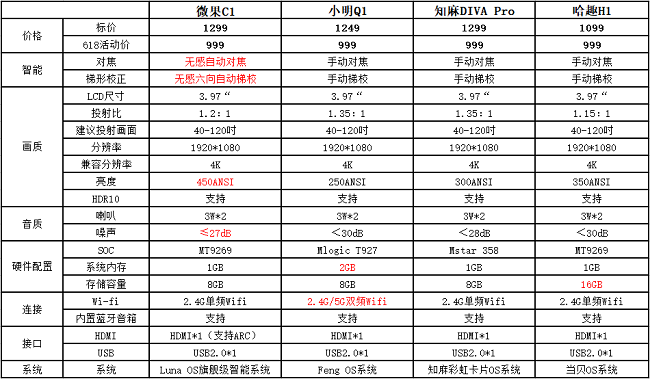 微果C1总结一下,微果C1、小明Q1、知麻DIVA Pro、哈趣 H1这四款,在基础性能方面没有太大差异,但是微果C1的高亮度和无感自动对焦、无感六向自动校正,实在是让人无法拒绝的功能。再加上618大促,大家都是999的价格,买微果C1的性价比最高。