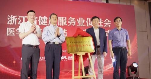 随后,浙江省健康服务业促进会朱耀传、浙江省基层卫生协会会长王国敬、中山医院副院长鲁科达、杭州大诚医院、杭州医诚健康董事长韦成共同为医学专家工作站揭牌。