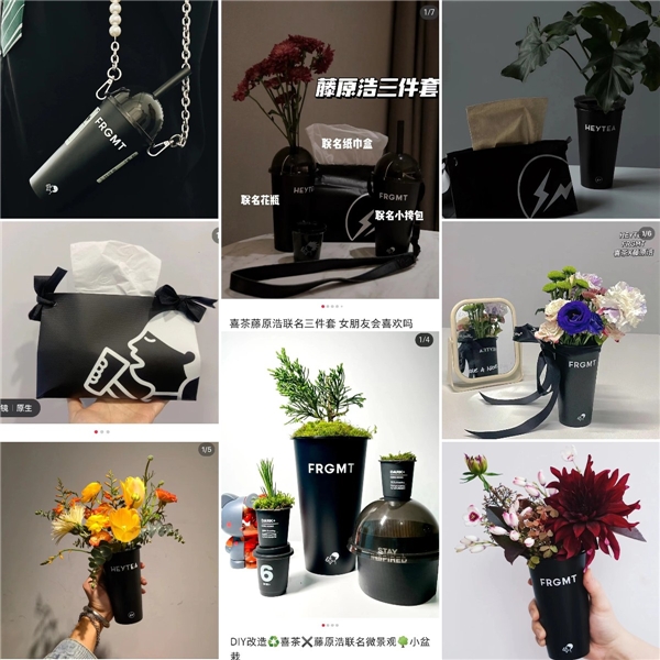除了销售的火爆,在小红书、微博等社交平台,还可见由喜茶和藤原浩联名产品引发的二创风潮。不少消费者在购买酷黑莓桑后,充分发挥灵感,将联名的黑色饮品杯子、包装袋、保温袋等留下进行二次创作。比如,饮品杯被改造成了花瓶、笔筒,保温袋则摇身一变成为背包、纸巾盒等,从前被人们习惯性丢弃的饮品包材成为了日常可循环使用的潮流单品。此次合作所引发的大量UGC二创内容,既展现了新茶饮消费者自身个性态度与藤原浩所代表的的潮流文化的碰撞,也让喜茶品牌的“灵感与酷”得到进一步彰显。