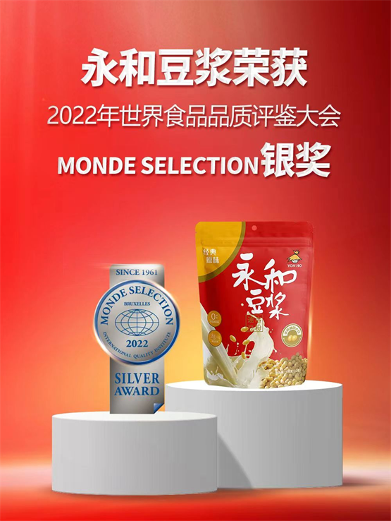 近期,在2022年世界食品品质评鉴大会(Monde Selection)上,永和豆浆经典原味豆浆粉350g凭借卓越品质脱颖而出,一举斩获“2022年世界食品品质评鉴大会银奖”。