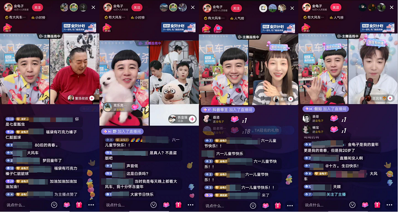 活动期间,抖in宝贝计划联动前《大风车》主持人共创六一主题特色内容,奉上满满童趣,与站内大小朋友一起过六一,掀起一波又一波的童年回忆杀。6月1日晚,金龟子抖音直播间准时开播,开播不久直播间观看人次就突破10万。直播中,金龟子接连连麦董浩叔叔、吾皇猫作者白茶、痞幼、王北川等嘉宾,为观众送上儿童节礼物,并带来《大风车》、《大头儿子小头爸爸》、《小螺号》等儿歌串烧,把大家带回了童年,引发大型“回忆杀”。