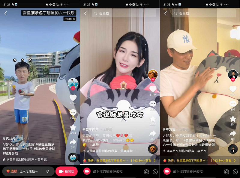 借助动漫和萌宠特有的治愈和激励人心的特质,活动接入动漫IP、萌宠的话题玩法同样备受关注。#吾皇猫承包了明星的六一快乐#话题下,贾乃亮、黄奕、李乃文等明星通过与吾皇猫创意合拍,花式过六一引爆声量,快速提升动漫、玩偶产品的认知。同时,创意话题#我的毛孩子能治愈一切不快乐#精准对标有宠一族,捕捉到萌宠过六一的节日趋势,联动宠物达人和商家引领“毛孩子过六一”的风潮,以“可爱+治愈”的个性标签内容,实现高效种草创造生意增长可能。