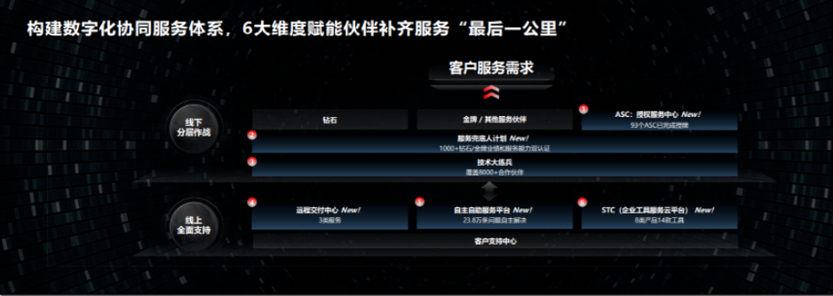 面向客户数字化转型带来对服务更高的要求,华为构建了线上+线下的数字化协同服务体系,从6个维度上赋能伙伴一起服务好客户:线下服务除了钻石和金牌伙伴外,面向商业市场,初期已经完成93个授权服务中心的授牌,通过服务授权中心(ASC)把地市区县的客户连接起来。线上服务除了客户支持业务外,也建设远程交付中心,通过智能化数字平台及AI辅助让客户和伙伴的问题得到自助解决;企业工具服务云平台集成了8类产品14款工具的持续优化和改进,通过“工具万里行”等活动向伙伴推广使用,提升服务效率。线上和线下服务相互协同不断促进,最终构建更多更好的能力服务好客户和伙伴。