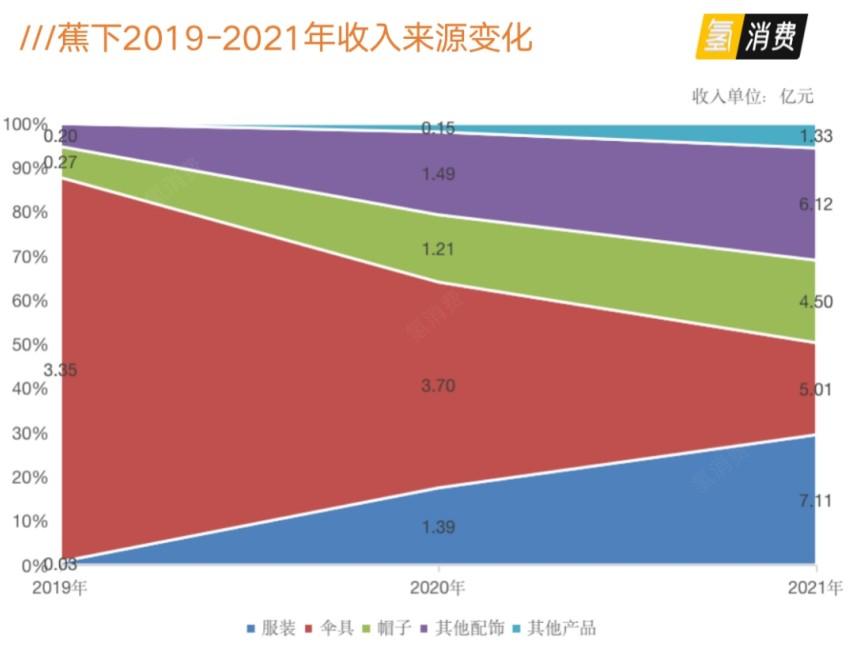 服装、伞具、帽子、其他配饰,在2021年的收入占比分别为29.5%、20.8%、18.7%、25.4%,相比2019年和2020年伞具独占86.9%和46.5%的比例来说,各品类对营收的贡献度逐步持平。