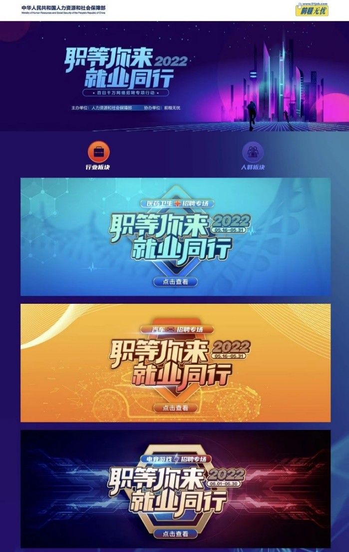 除高校毕业生群体外,全国城镇就业同样面临压力。据国家统计局数据,5月份,全国城镇调查失业率为5.9%,31个大城市城镇调查失业率为6.9%。为进一步服务好全国城镇就业,前程无忧同样连续第三年积极承接人社部“职等你来,就业同行”百日千万网络专项行动,紧扣各地实际情况,通过聚合页面和智能人岗推荐打破就业双方信息差,持续推出有针对性、特色化的网络招聘活动。