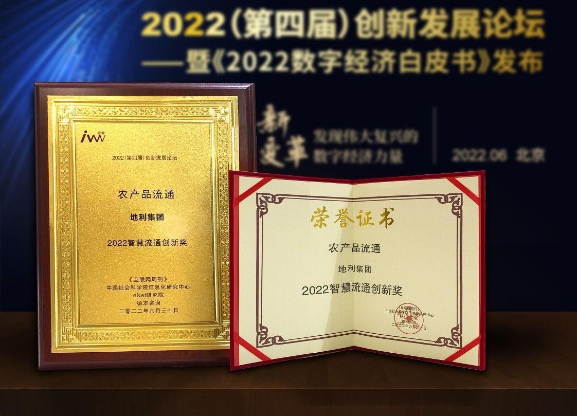 “2022(第四届)创新发展论坛”由中国科学院主管的行业权威媒体《互联网周刊》、中国社会科学院信息化研究中心、eNet研究院等机构联合主办。地利集团荣膺金i奖“2022智慧流通创新奖”,既是数字化领域权威研究机构和主流媒体对地利集团推动农产品流通这一传统行业实现智慧升级成果和贡献的高度认可,也是对地利集团科技自主创新理念和精神的肯定和激励。