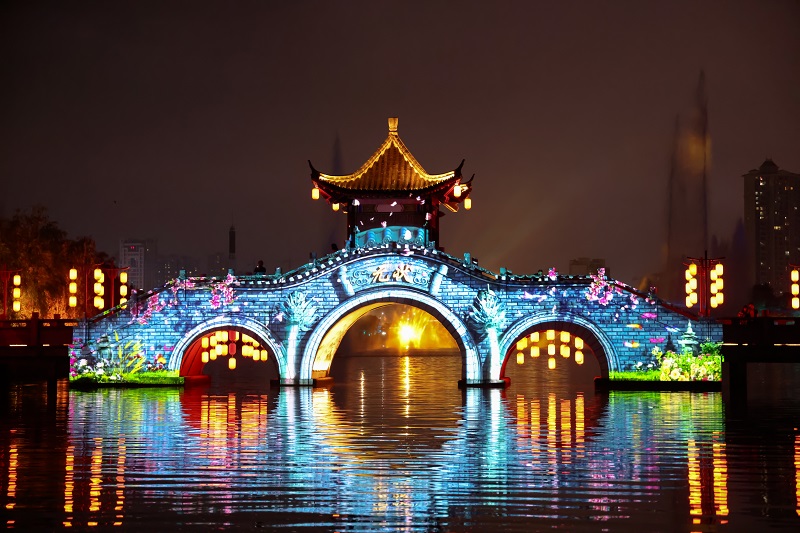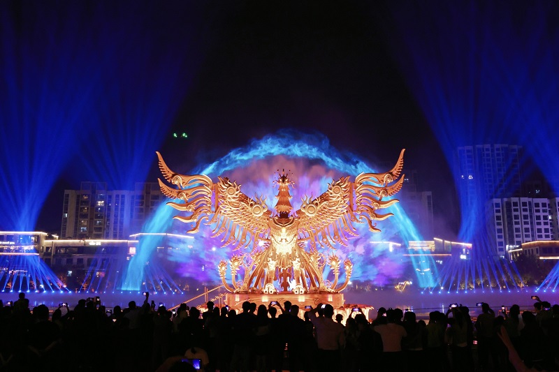 作为匠心打磨的吉安“城市之眼”,后河·梦回庐陵景区深入挖掘千年庐陵文化,选取自秦朝、唐宋、明清再到现代吉安的动人故事,以“沉浸式光影夜游”为主线,设置“龙腾庐陵”、“歌飞庐陵”、“诗境庐陵”、“书香庐陵”、“凤舞庐陵”五大板块的光影场景,以创新思维探索光影技术与场景的融合,营造“穿越感”氛围,打造一条梦幻的庐陵文化长河。