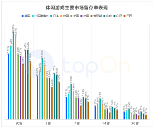 日韩市场整体对休闲游戏接受度高,日本次留超过韩国