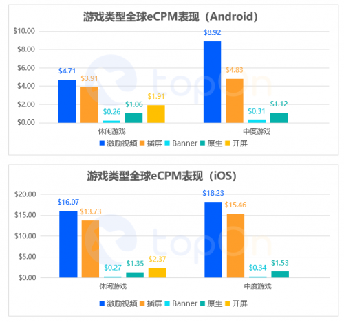 各游戏类型eCPM整体稳定,双端激励视频、插屏各有涨跌