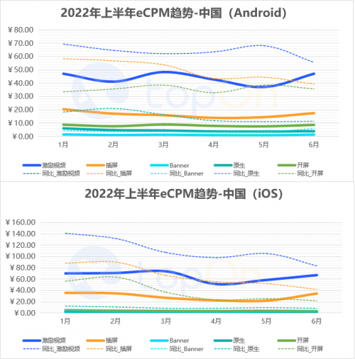 2022上半年,受限于版号、疫情等相关因素,国内手游广告变现收益整体下跌。新品无法如期上线,用户方面,据伽马数据统计,2022年3月和4月,国内游戏用户规模同比出现了下降,并达到了近一年来的最低水平。加之疫情反复,国内广告主预算缩减,多部门的合规整改影响仍在持续,导致整体获益表现不佳。但随着环境向好,5、6月的激励视频和插屏广告的eCPM走势较4月已开始回升。