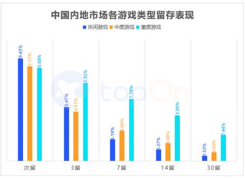 在休闲游戏和中度游戏留存率都下跌的情况下,重度游戏的次留、7留、14留和30留对比2021年都有明显上涨。原因为受疫情影响,部分地区用户宅家时长变长,重度游戏成为用户消磨时间的选择。