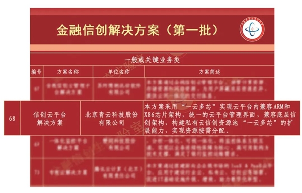 此次入选《金融信创解决方案(第一批)》的青云信创云,是真正自研的信创平台,兼容 ARM 与 x86 芯片,以“一云多生态”实现了与信创芯片、服务器、交换机、操作系统及其他软硬件生态的全方位兼容覆盖,与超过 100+ 的行业伙伴应用建立了广泛的信创适配和产品互信测试,并服务了包括光大银行、北京农商银行、中国银保信、鼎和财产保险等在内的数十家金融机构的信创项目落地,业务场景涉及开发测试区、核心生产区、同城与异地灾备区及互联网创新业务区等,有力推进了信创与金融业务的深度融合,形成可复制的、有价值的经验。