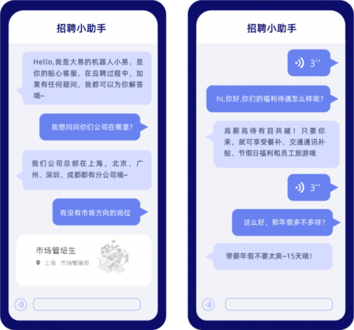 其中,AI客服和AI外呼致力于解决繁琐型事务。AI客服机器人是候选人的问答专家,7*24小时回答候选人关心的问题,它还可以根据对话内容智能推荐合适职位,引导候选人的职位投递;AI外呼则是HR传达信息的帮手,HR可以同时发起上百个电话,对候选人进行基本的问候与提醒、意愿的咨询等等。