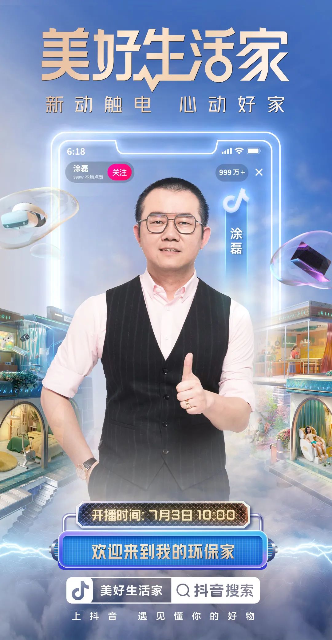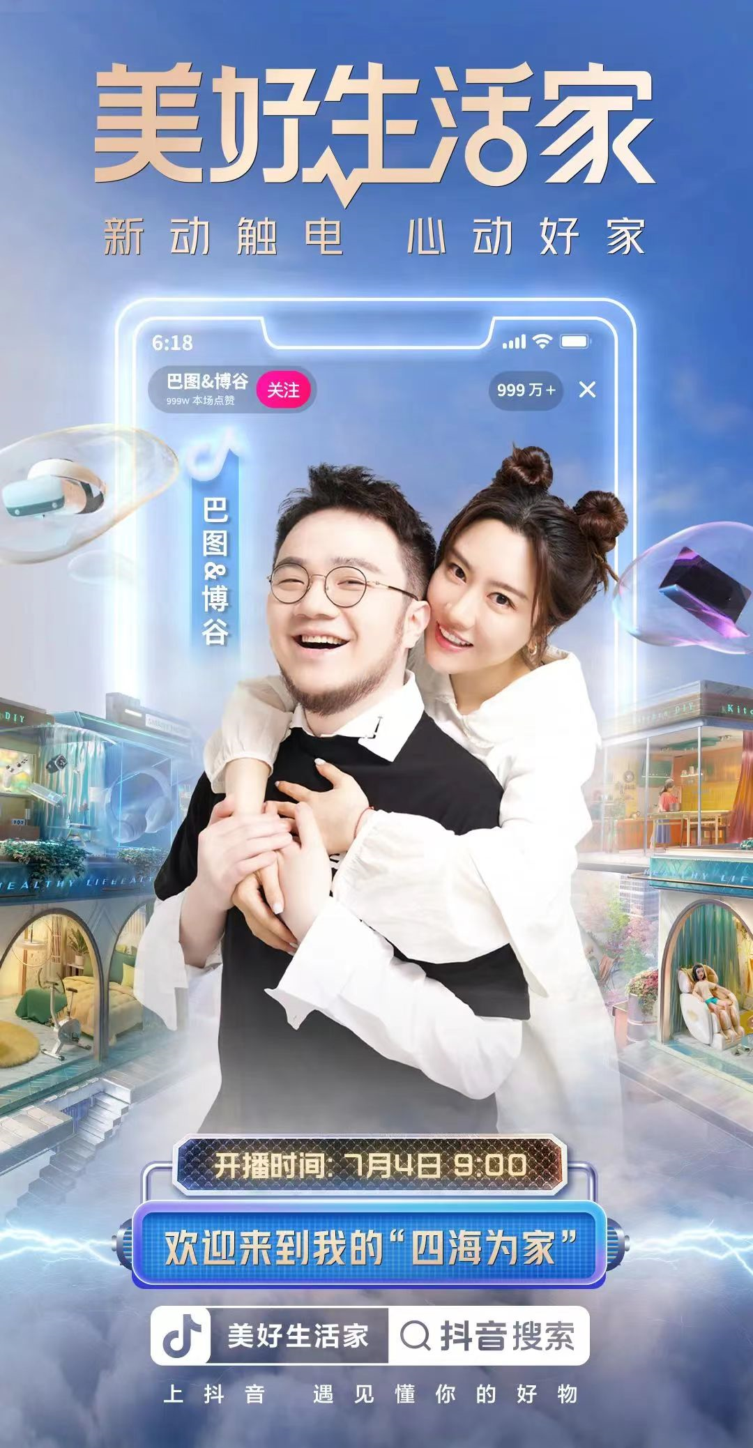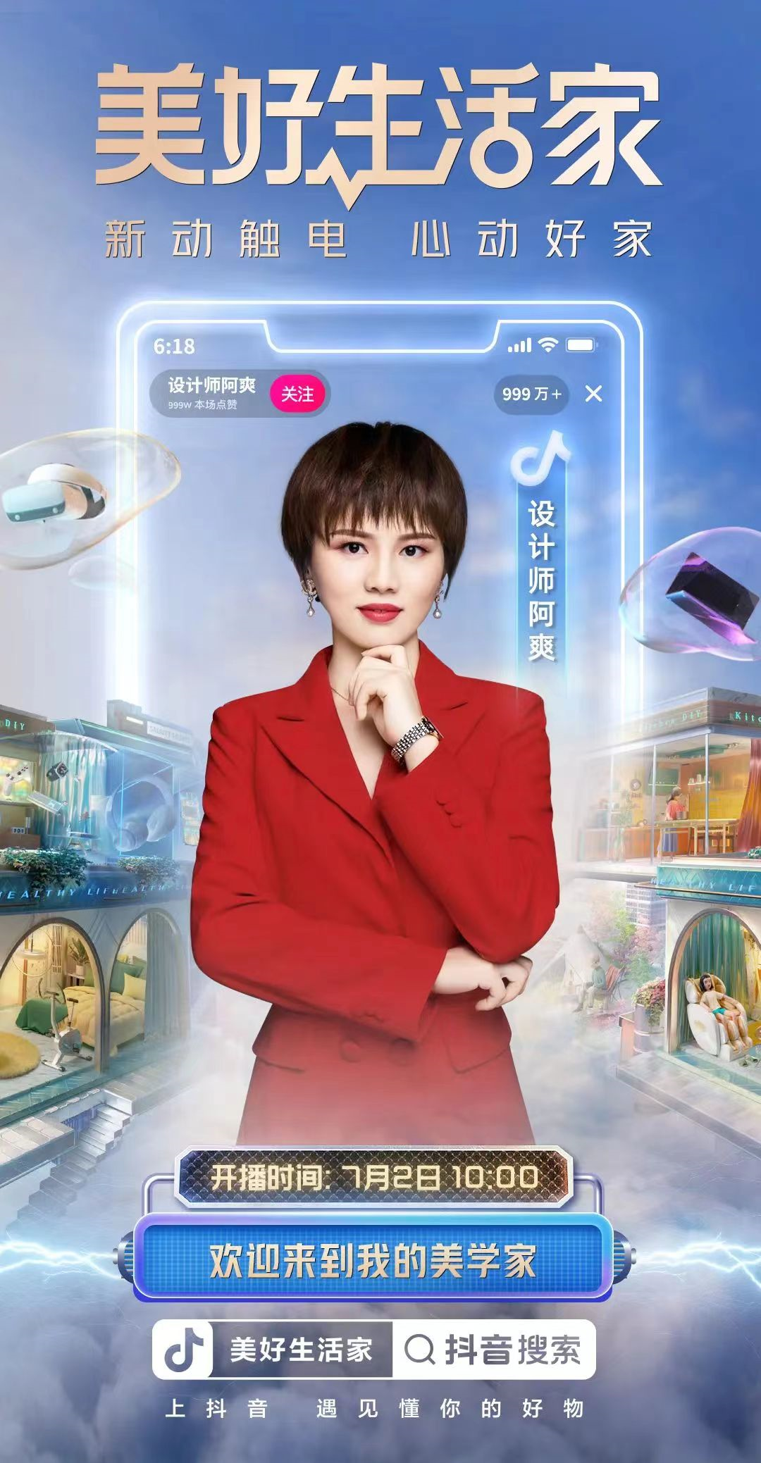 其中,「美好生活家」「心动新方式」主题直播间,从美学家、智能家、环保家、魔法家、发明家、四海为家6大主题,分别契合以上6大家居心动新方式,携手涂磊、巴图&博谷、电器哥梓涵、设计师阿爽等明星达人,以心动内容激发用户兴趣,共同打造家居好物全域经营矩阵。抖音电商「美好生活家」为参与活动的直播间提供高流量扶持,并通过搜索位推荐、官方话题短视频置顶等黄金资源,实现「新动触电」「心动好家」多触点深度种草。