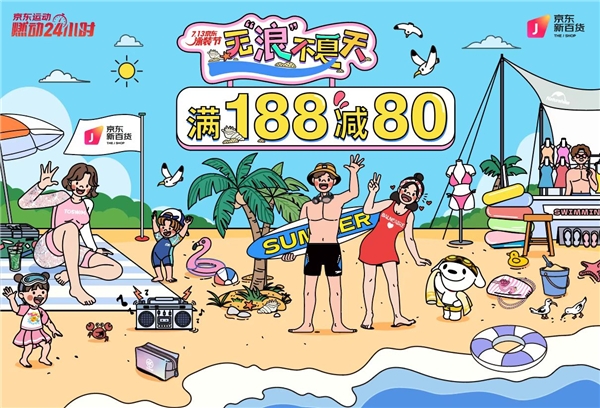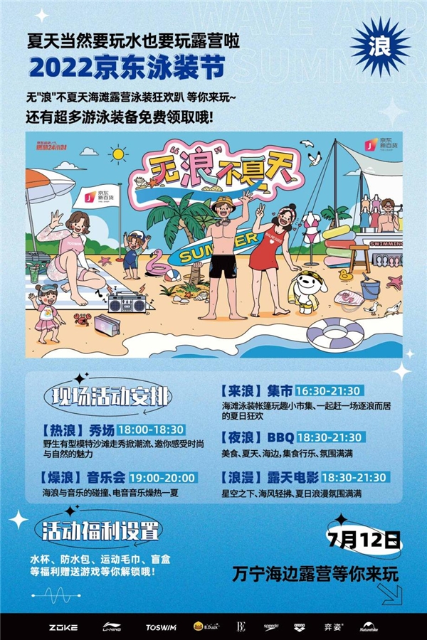 京东运动x京东新百货x 知名泳装品牌(speedo、拓胜、范德安、arena、弈姿、小黄鸭、李宁、洲克等)将于7月12日在”海南万宁神州半岛喜来登“打造仲夏激情,结合夏日玩水场景设置【来浪】集市、【热浪】秀场、【燥浪】音乐会、【夜浪】BBQ、【浪漫】露天电影五大活动,打造一场面向品质爸妈、运动型男、颜值gril的“率”“燃”“敢”“潮”“玩”“野”的泳装时尚玩水大秀。整场活动以求在满足休闲玩乐、文艺时尚等多重消费娱乐需求的同时,建立“买泳装 逛京东”的消费心智。