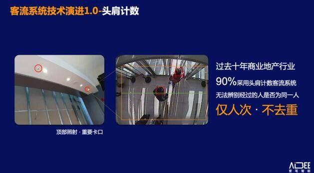 在计算机视觉技术开始应用至购物中心领域之后,客流系统得到了质的改变。最早利用计算机视觉技术开展客流统计的时代,我们称之为“客流系统1.0”,其主要是通过摄像头的部署,从上往下拍摄,通过识别人的头肩特征进行客流计数,也叫头肩客流。