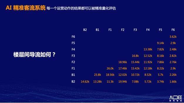 除了提供全场到访人数、各楼层到访人数等日常所需的统计数据,以及基于此获得的爬楼率等运营指标外,Aibee AI 精准客流系统可以清晰地帮助购物中心运营者了解楼层间、业态间、店铺间的相互导流情况。