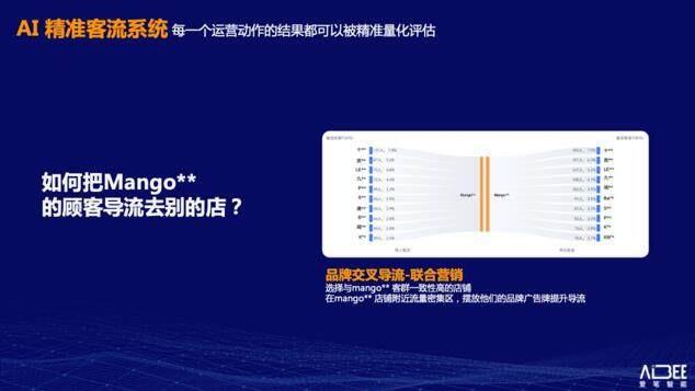 在调整店铺导流的过程中,依旧可以靠数据衡量效果、推动决策。下图即餐饮店 Mango** 在购物中心被导入的流量与其导入其他店铺的流量。通过交叉客流的洞察,可以找到 Mango** 与哪些店铺关联密切,客群一致性高,进而在Mango**店铺附近的流量密集区,通过设置广告牌等联合营销方式,推动交叉导流。