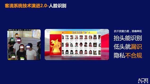 基于每个顾客的人脸 ID,客流系统2.0可以实现一定程度上的去重效果,但是这一方案对顾客状态的要求比较高,顾客在抬头时可以识别,但顾客一旦低头、转身,就容易出现漏识,准确率不稳定。不过,自2021年《个人信息保护法》出台,明确规定了购物中心内顾客未同意情况下进行人脸识别属于违法行为,这一技术基本淡出市场。
