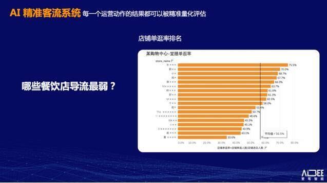 “单逛率“可以帮助购物中心运营者判断商场中引入的店铺,其导流情况是否与预期相符。而在 AI 精准客流系统中,数据的颗粒度之细,可以让运营者清晰了解每个店铺的单逛情况,精准找到导流弱的店铺,让运营者有的放矢地通过运营手段改善店铺导流情况。“我们可以进一步找出单逛率很高的餐饮店铺都有哪些,再去进一步挖掘场内哪些零售店与这些餐饮店客群的兴趣重合度高,进而就能找到调整店铺导流的正确方式”。