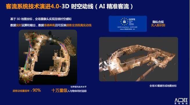 值得一提的是,客流系统4.0所采用的 3D 时空动线技术,不收集任何人脸特征等生物识别信息,也不存储任何个人信息,整个过程全匿名化,均在法律允许的范围,极为注重对顾客的隐私保护。该客流系统通过 GDPR 合规评估——符合欧盟 GDPR 合规要求(General Data Protection Regulation,通用数据保护条例)。此前更获得由英国标准协会(BSI)授权颁发的 ISO/IEC 27001:2013 信息安全管理体系认证与 ISO/IEC 27701:2019 隐私信息管理体系认证,Aibee 是国内首个获得GDPR、ISO/IEC 27001及27701三重认证的 AI 公司,在隐私保护、信息安全、数据安全方面已走在行业前列。